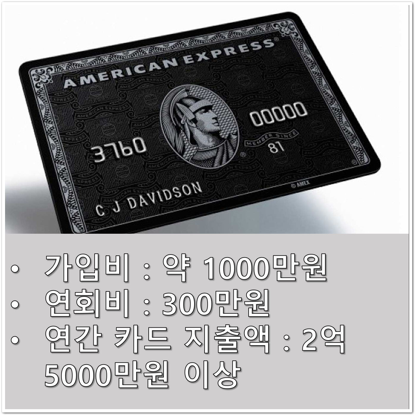 블랙카드는 말그대로 블랙카드 입니다. 일단 아메리칸 익스프레스 블랙카드 가입비는 약 1천만원이며 연간 회비로는 3백만원 입니다. 또 연간 카드 지출액이 2억 5천만원 이상이어야 신청자격이 주어지는 상위 0.1%만 가질 수 있는 프리미엄 카드라고 할 수 있습니다.
