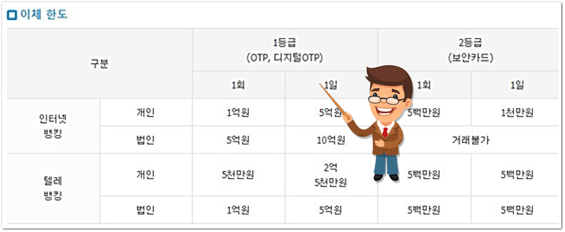 그러나 otp를 이용한다면 이체한도가 높게 할수 있습니다. otp 같은경우 개인은 1회 1억까지 이고 1일 5억까지 이체가 가능합니다. 텔레뱅킹은 1회 5천만원 이고 1일 2억 5천만원까지 이체가 가능합니다. 법인 텔레뱅킹은 1회 1억 이고 1일 5억으로 이용 금액이 낮아지게 되니 참고하시기 바랍니다.
