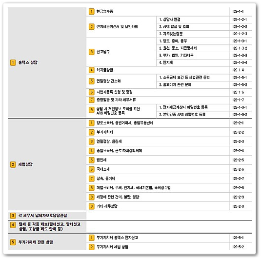2) 부가가치세 세법 상담은 (126-5-2) 번으로 연결하시면 됩니다. 3) 세법관련 종합소득세 상담은 (126-2-4) 번으로 연결하시면 됩니다. 126-2번의 경우는 연말정산, 법인세, 상속,증여세 같은 세법과 깊은 관련이 있는 부분으로 상담이 가능한 서비스 입니다.