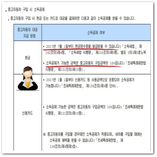2) 자동차 구입비용 현금영수증 발급 가능한가 : 결론부터 말씀드리자면 2017년 7월 1일부터 현금영수증을 발급 받을 수 있습니다. 그러나 소득공제가 가능한 금액으로는 중고자동차 구입금액에서 10%라고 합니다. 차량대금과 같이 수수료를 딜러한테 바로 입금하는 경우라면 현금영수증을 받기 힘들 수 있어 차량대금은 매매상사를 통하여 입금하시는고 현금영수증을 받으시는 것이 가장 좋은 방법입니다.