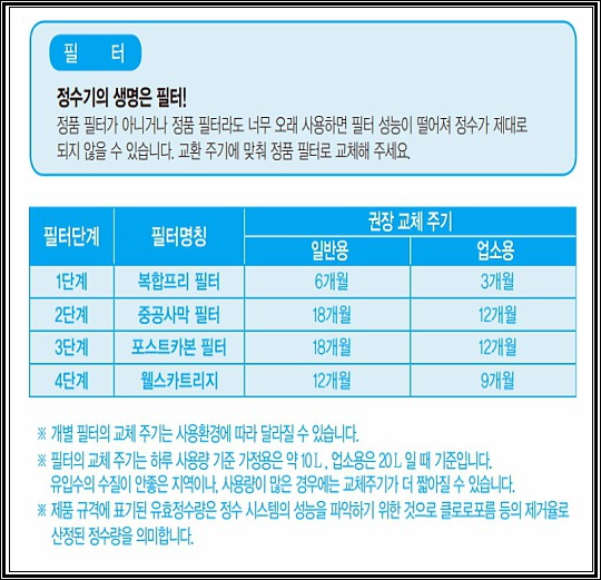 정수기를 사용할 때는 정기적으로 필터를 교체하여 최적의 상태를 유지해야 깨끗한 물을 먹을 수 있습니다. 또 소모성 부붐인 필터의 권장 교체 주기로는 품질보증기간의 표시가 아닙니다. 제품 및 사용환경에 따라서 교체 주기를 단축될 수 있는 부분입니다. 또 제품의 성능을 위하여 꼭 교원 순정품 필터를 사용하시는 것이 좋기에 정품 필터가 아니라던지 정품 필터가 너무 오래 사용해서 필터 성능이 떨어져 정수가 제대로 사용 되지 않을 수 있습니다.