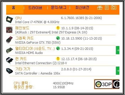 3dp chip 설치 하실땐 어려울것 없이 최신버전을 다운받아서 설치해주시면 cpu 드라이버, 메인보드 드라이버, 그래픽 카드 드라이버, 사운드 드라이버, 랜카드 드라이버 등의 드라이버를 자동으로 잡아주고 그것을 설치할 수 있도록 창이 나옵니다 그것을 클릭해주시면 해당 드리이버의 공식 홈페이지 또는 다운로드 사이트로 넘어가게 되고 그곳에서 다운로드를 받으시면 됩니다.