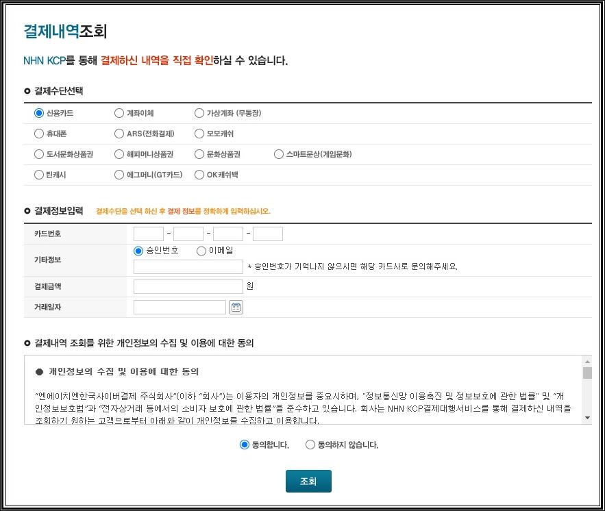 위에서도 말씀드렸다 싶이 kcp자동과금은 여러 온라인 서비스에서 결제하는 서비스를 대행해주는 것으로 어떠한 서비스에서 정기적 사용 및 결제를 진행하여 청구되고 있다는 것입니다. 그래서 이 문자내역을 받았다면 일단 확인부터 해봐야 합니다. 바로 kcp 홈페이지에서 확인이 가능합니다. 홈페이지로 들어가셨다면 메인에서 우측 바로가기 메뉴에서 '신용카드 이용내역 조회' 버튼을 눌러주시면 결제를 하고 있는 전해년도 1월1일부터 현재의 거래 내역까지 전부 제공되고 있습니다. 당연히 조회할 때는 결제되고 있는 카드 번호를 입력해야 합니다.