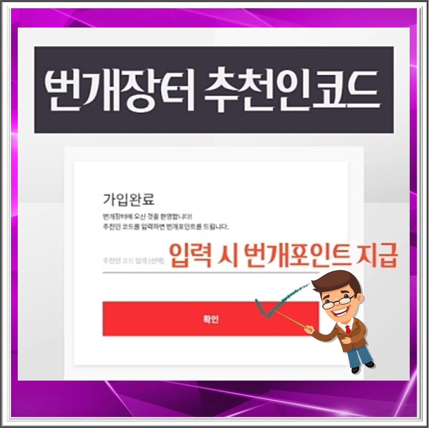 추천인코드라는 것은 말그대로 회원가입을 할때 가입자가 추천인에게 포인트를 주는 것과 같은 의미 입니다. 그러나 번개장터의 경우는 번개장터 추천인코드는 입력시 가입자에게 1000포인트를 주고 우수자에게는 등수에 해당하는 포인트를 지급하게 됩니다. 우수자는 추천인을 뜻합니다. 그리고 우수자가 되면 현금처럼 사용할 수 있는 포인트를 받을 수 있기에 많은 사람들에게 초대 유도를 하여 추천인코드로 받는다면 꽤 많은 포인트를 받을 수 있게 됩니다. 그리고 친구 코드를 받았다면 해당 코드를 입력하여 확인 버튼을 누르시면 됩니다.