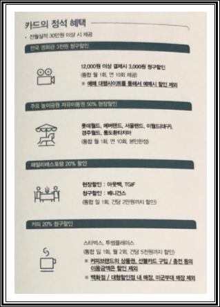 또 체크매출 결제된 금액에서 0.3% 할인이 되는데 1만원 미만은 할인에서 제외됩니다. 또 신용매출로는 전월 결제 실적에 따라서 할인율이 꽤 달라지게 되며, 전월 실적 50만원 미만이라면 0.5%, 50만원 이상이라면 0.7%, 100만원 이상이라면 1.0%의 할인을 받게 됩니다. 전월 실적 30만원 이상은 영화관 및 공원, 가맹정등에서의 할인 적용이 가능합니다.