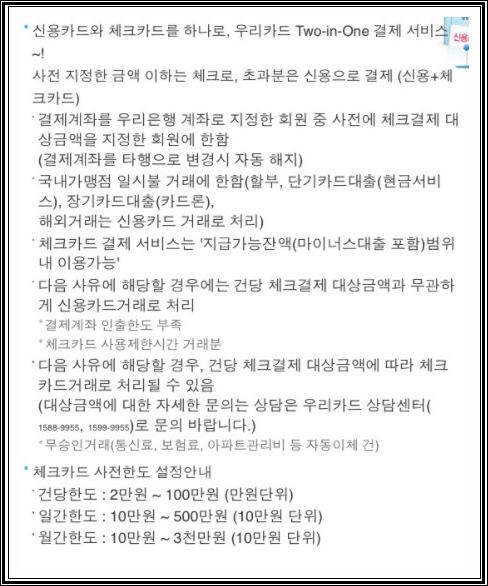 그리고 해당 카드는 Two-In-One 결제 서비스를 제공 하는데 투인원은 신용카드에 체크카드 기능을 결합한 것입니다. 사전에 지정했던 금액 이하는 체크로 결제 초과되는 부분에서는 신용카드로 결제되는 시스템입니다. 그리고 통장 잔고가 부족하거나 없는 상황이라면 신용매출로 승인이 나오게 됩니다.