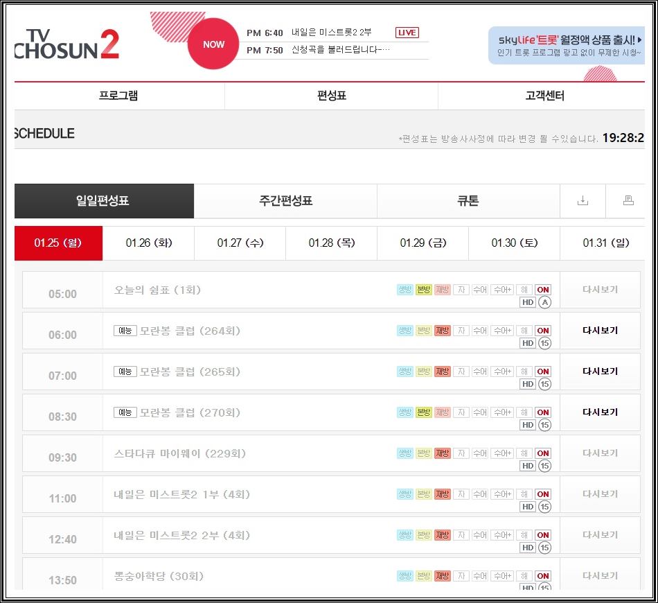 좀더 해당 채널에서 방송되고 있는 프로그램들을 보시고 싶으시거나 tv조선2 편성표를 확인하고 싶으신 분들은 네이버, 다음, 구글에서 tv조선2 홈페이지로 접속하시면 바로 확인이 가능하십니다.