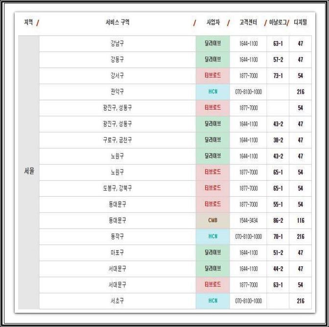 해당 채널번호로 서울지역에서 사용하고 있는 서비스 구역들로는 강남, 강동, 강서, 관악, 광진, 성동, 구로, 금천, 노원, 도봉, 강북, 동대문, 동작, 마포, 서대, 서초, 성북, 송파, 양천, 영등포, 용산, 은평, 종로, 중구 등이 있습니다. 그리고 해당 tv조선2 채널을 운영하고 있는 방송 사업자들로는 cj헬로비전, cmb, hcn, 딜라이브, 티브로드가 서비스 중에 있습니다.