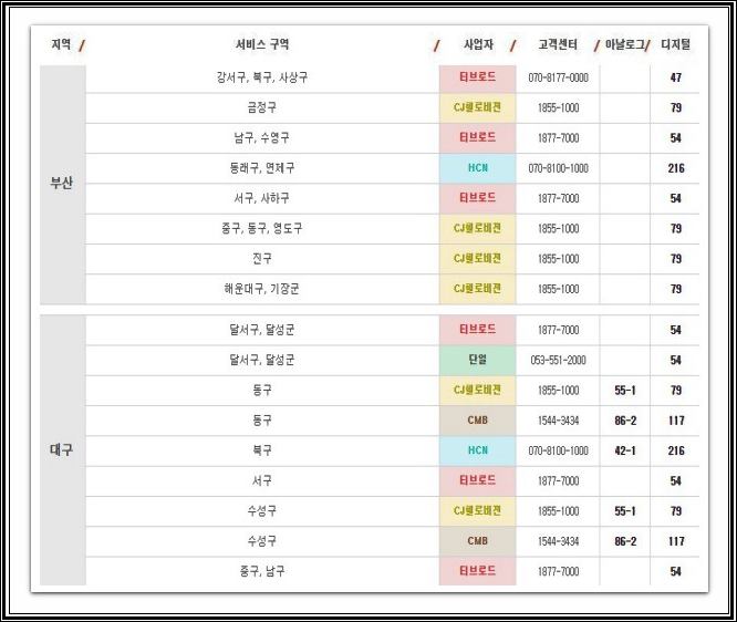 부산지역으로는 강서구, 북구, 사상구, 금정구, 남구, 수영구, 동래구, 연제구, 서구, 사하구, 중구, 동구, 영도구, 진구, 해운대구, 기장군 등이 있으며, 대구 지역은 달서구, 달성군, 동구, 북구, 서구, 수성구, 중구, 남구 등이 있습니다. 그리고 대전지역은 둥구, 대덕구, 중구, 서구, 유성구가 있으며, 광주지역은 동구, 북구전역, 서구, 남구, 광산구 전역이 있습니다.