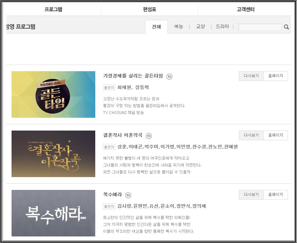 좀더 해당 채널에서 방송되고 있는 프로그램들을 보시고 싶으시거나 tv조선2 편성표를 확인하고 싶으신 분들은 네이버, 다음, 구글에서 tv조선2 홈페이지로 접속하시면 바로 확인이 가능하십니다.