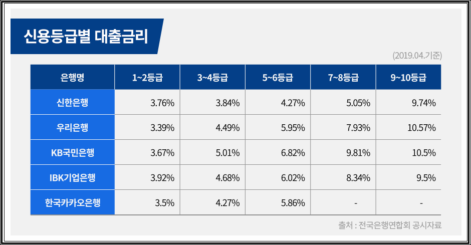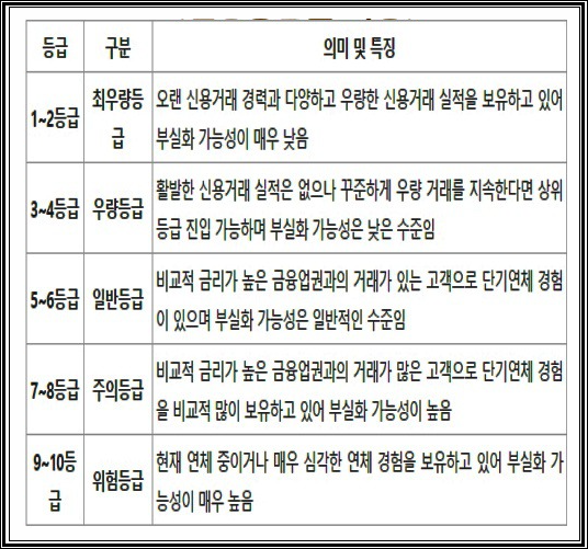 옛날 신용등급은 1~10등급 형식으로 등급을 주어서 산정하였습니다. 그리고 신용등급 같은 경우는 연체, 다중채무, 연체기간, 반복횟수 같은 것들을 종합하여 산정하게 됩니다. 그리고 신용등급(신용점수)가 낮다면 은행에서 대출을 받기가 어려워 지며 대출금리 또한 올라가게 됩니다.