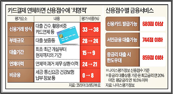 많은 분들이 제도권에서 대출을 못받게 될 때 비제도권 또는 3,4금융권에서 대출을 받게 될 때 또는 현금서비스등을 이용하게 될 때 신용점수에 대한 점수가 좋지 못해질 수 있습니다. 그리고 연체또한 신용점수에 대한 문제가 생길 수 있습니다.