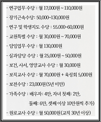 그 금액들로는 5년 ~ 10년 미만은 5만원, 10년~15년미만 6만원, 15년~20년미만 8만원의 정근수당 가산금을 받게 된다고 합니다. 거기에 연그업무 수당, 장기근속수당, 담임업무 수당, 가족수당, 자녀수당으로 첫째, 둘째, 셋째로 나뉘어져서 받을 수 있다고 합니다. 좀더 자세한 부분으로는 이미지들로 확인하시기 바랍니다.
