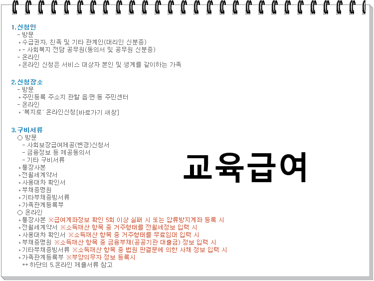 다음으로 생계급여, 의료급여, 주거급여, 교육급여 등이 있는데요. 간단히 설명드려서 생계급여액은 선정기준액에서 해당 가구의 소득 인정액을 차감한 금액이며, 의료급여는 중위소득 40% 이하 기초생활수급자에게 지원이 된다고 합니다. 주거급여는 중위소득 45% 이하에게 선정기준이라고 할 수 있습니다. 마지막 교육급여는 학생 개개인들에게 자율적 활용이 가능하며 교육활동지원비로 통합 지원이 된다고 합니다.