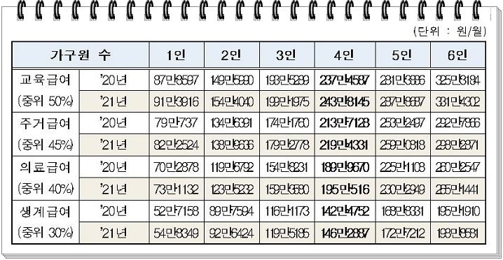 여기서 2021년 기초생활수급비를 지원받으려면 소득 인정액이 급여별 선정기준에 만족이 되어야 한다고 합니다. 그래서생계급여 같은 경우는 중위소득 30%이하 의료급여 중위소득 40% 이하, 주거급여 중위소득 45% 이하, 교육급여 중위소득 50%이하인 경우에만 지급을 받을 수 있다고 합니다. 또 소득인정액으로는 소득평가액과 재산의 소득 환산액을 합산한 금액이라고 할 수 있습니다.