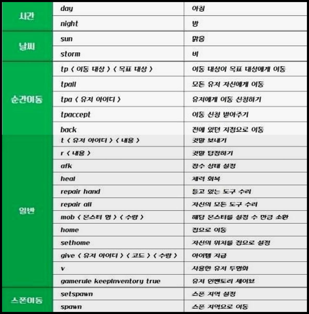 모바일 마인크래프트를 하다보면 한국인의 특성상 빠른 운영을 원하시는 분들이 있습니다. 그래서 그 명령어들 중에서는 시간 명령어, 날씨명령어, 순간이동 명령어, 처벌 명령어, 서버 명령어, 일반 명령어, 스폰이동 명령어 등이 있습니다. 명령어를 실행하는 방법으로는 월드에 접속후 채팅창에  [ / ] 슬라이드 키를 입력 하시면 이용 가능한 명령어들이 나옵니다. 그 명령어들은 아래 이미지를 확인하시고 입력하셔서 이용하시기 바랍니다.
