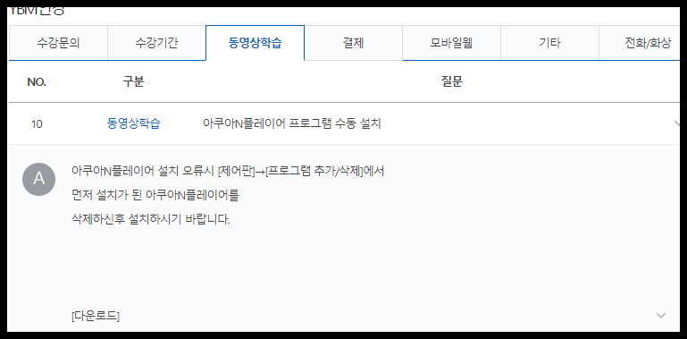 많은 인강이 존재 하다보니 불법 복제에 대한 문제가 심각해 지고 있습니다. 그래서 AquaNPlayer를 많이들 사용하고 있는듯 합니다. 우선 아쿠아 플레이어는 ybm 에서 플레이어 설치 다운로드를 제공 하고 있습니다. (링크) 해당 링크를 통해서 들어가시면 다이렉트로 ybm 인강 플레이어인 아쿠아 플레이어를 다운로드 받으실수 있습니다.