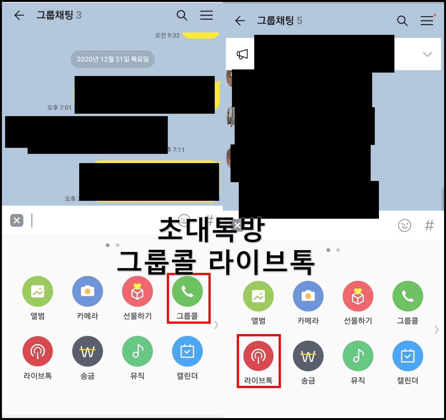 그렇다면 카카오톡 단체 페이스톡은 불가능 하지만 카톡 그룹콜은 가능할까요? 네 가능합니다. 단 오픈채팅 방에서는 카톡 그룹콜이 불가능 하고 초대를 통한 단체 톡방에서는 그룹콜을 이용하실 수 있습니다. 최대 이용은 3 ~ 10명까지 이용이 가능하며, 이용시 음성 서비스에 굉장히 혼선이 생길 수 있기에 참고하시고 사용하시기 바랍니다. 혹시나 미팅 또는 회의등으로 이용해야 한다면 카톡 그룹콜 보다는 구글미팅을 통하여 편하게 이용하시길 추천드립니다.