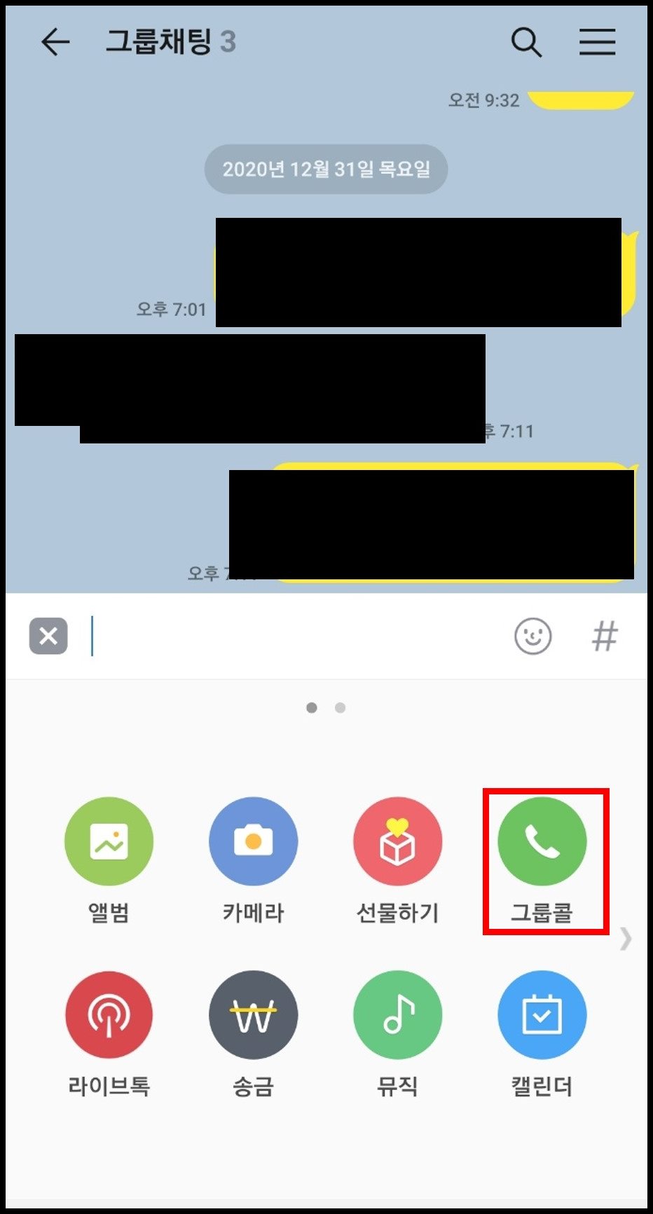 그렇다면 카카오톡 단체 페이스톡은 불가능 하지만 카톡 그룹콜은 가능할까요? 네 가능합니다. 단 오픈채팅 방에서는 카톡 그룹콜이 불가능 하고 초대를 통한 단체 톡방에서는 그룹콜을 이용하실 수 있습니다. 최대 이용은 3 ~ 10명까지 이용이 가능하며, 이용시 음성 서비스에 굉장히 혼선이 생길 수 있기에 참고하시고 사용하시기 바랍니다. 혹시나 미팅 또는 회의등으로 이용해야 한다면 카톡 그룹콜 보다는 구글미팅을 통하여 편하게 이용하시길 추천드립니다.