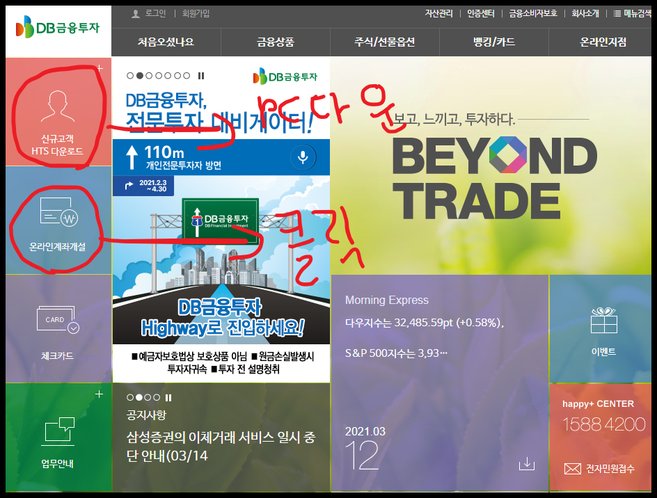 - PC계좌개설 예) 동부증권을 예시로 보여드리면 홈페이지 접속하시면 바로 계좌개설할 수 있는 버튼이 보입니다. 해당 버튼을 누르시면 그다음 안내 메시지와 함께 계좌를 개설 하시면 됩니다. 다른 증권사들도 홈페이지 계좌개설이 있으나 몇군데는 스마트폰 앱을 다운 받아서 계좌개설하는 쪽으로 유도 하는곳들이 많이 있습니다.