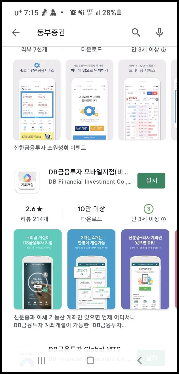 - 스마트폰계좌개설 스마트폰 또한 아주 쉽습니다. 구글플레이스토어에서 동부증권을 검색하시면 3번째 앱을 설치하시면 계좌 개설 방법을 바로 안내 합니다. 증권사들에서는 증권사 앱 과 증권사 계좌개설 앱이 따로 뜨게 됩니다. 이점 잘 확인하시고 계좌 개설을 하시기 바랍니다.