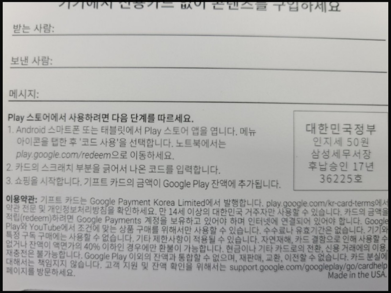 - 편의점에서 구글기프트카드 현금으로 구매 ( 구매시 편의점에 금액만큼 충전요청 )