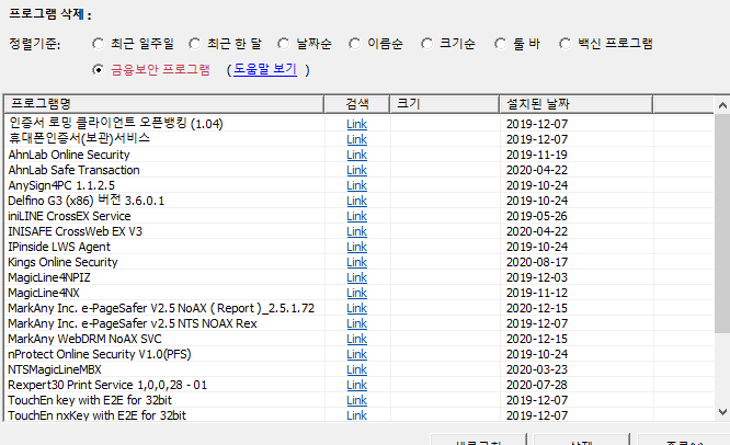 이유는 모든 금융사 및 은행,증권사 사이트들은 개인정보보호 및 금융정보보호 등을 위해서 다양한 보안프로그램들을 사용하고 있기 때문입니다. 그런데 해당 프로그램을 사용안하고 삭제한다면 당연히 금융관련 사이트 접속에 문제가 생기게 되는 것입니다. 그런데도 삭제하시려는 이유에서는 해당 프로그램들이 리소스를 많이 잡아 먹어서 pc가 느려진다던지 불안하기 때문입니다.