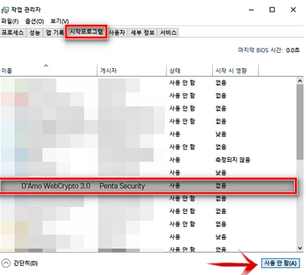 자! 그럼 위에 말씀드린것과 같이 해당 프로그램을 삭제하면 금융사이트에 접속할때 제한적이게 된다고 말씀드렸습니다. 그래서 다른 해결방법으로는 해당 프로그램을 수동으로 [사용안함]으로 바꾸는 방법입니다. [윈도우 작업관리자 실행 > 시작프로그램 카테고리 클릭 > D'amo WebCypto 3.0을 찾아줍니다. > 사용안함 클릭] 이렇게 하면 사용 리소스가 없어지게 되면서 사용이 안되게 됩니다. 그리고 금융관련 사이트를 들어갈 때는 사용함으로 바꺼주고 이용하시면 됩니다.