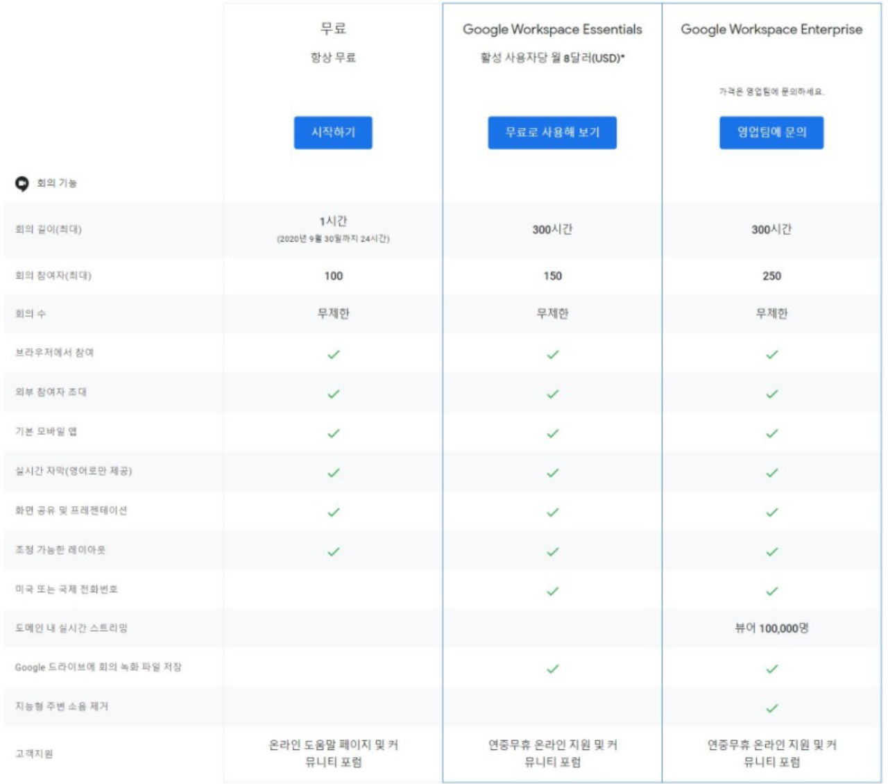 구글 미트 사용시 금액 : 구글 미트를 사용할 때 무료 사용, 구글 워크스페이스 에센셜, 구글 워크스페이스 엔터프라이스 3가지 종류가 있습니다. 이중 기본 무료 사용은 회의 길이 1시간,참여인원 100명, 국내 참여만가능 합니다. 그리고 에센셜, 엔터프라이스는 외국에서 참여가 가능하고 시간은 300시간 이상 그외에 추가적인 기능이 있습니다. 에센션은 월 8달러의 사용료를 지불하면 이용이 가능합니다.