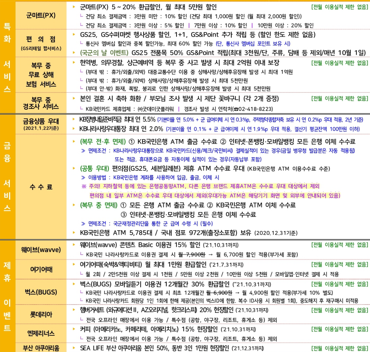 [나라사랑카드 국민은행 서비스(사용처, 혜택)] : (특화서비스 종류 '군마트(PX), 편의점, 복무중 무료 상해 보험 서비스, 복무중 경조사 서비스') (금융서비스 종류 '금융상품 우대, 수수료면제') (제휴이벤트 종류 '웨이브, 여기어때, 벅스, 롯데리아, 엔제리너스, 부산아쿠아리움') (일반서비스 종류 '대중교통, 영화관, 통신비, 놀이공원, 커피, 외식, 온라인 쇼핑, 어학, 서적') 나라사랑카드 사용처와 혜택에 대한 내용으로 이렇게 이용이 가능합니다.