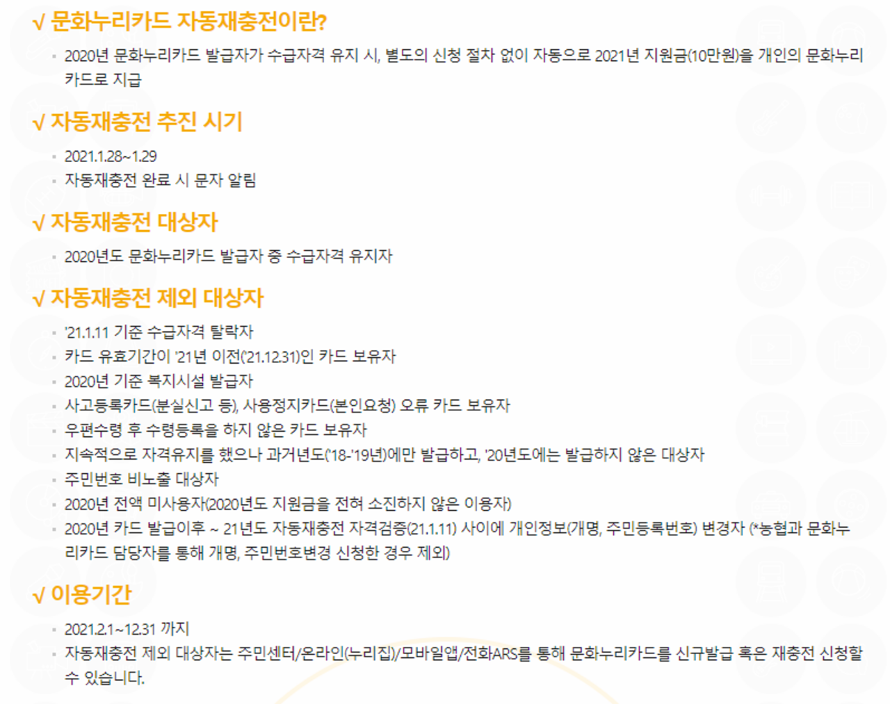 문화누리카드는 기초생활수급자, 차상위계층을 대상으로 문화예술, 국내여행, 체육활동에 대한 지원을 하는 카드입니다. 그래서 2021년 부터 1인당 연간 10만원을 지원한다고 합니다. 또 문화누리카드는 기획재정부 복권위원회의 복권기금을 받아서 추친하고 있는 공익사업이라고 할 수 있습니다. 문화누리카드를 사용하고자 하시는 여러 취약계층, 기초생활수급자 분들에게 조금이나마 정보를 드리고자 문화누리카드 사용처 및 잔액조회 방법과 발급대상에 대하여 정리해보았습니다.