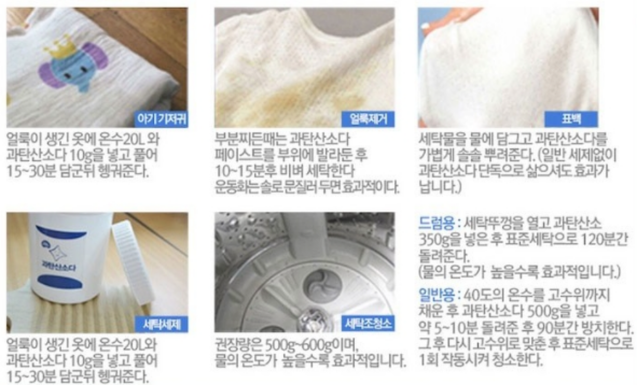 과탄산소다는 세탁, 표백, 얼룩, 찌뜬때, 냄세제거 세탁조 청소등으로 많이 사용하는 세재라고 알려져 있습니다. 그러나 활용방법을 잘 알지 못하고 사용하면 빨래가 상할 수 있으니 꼭 사용법을 제대로 확인하고 사용하시기 바랍니다. 특히 해당 세재는 찬물에는 잘 녹지 않으니 꼭 미지근한 물에서 사용을 해주는 것이 좋습니다.
