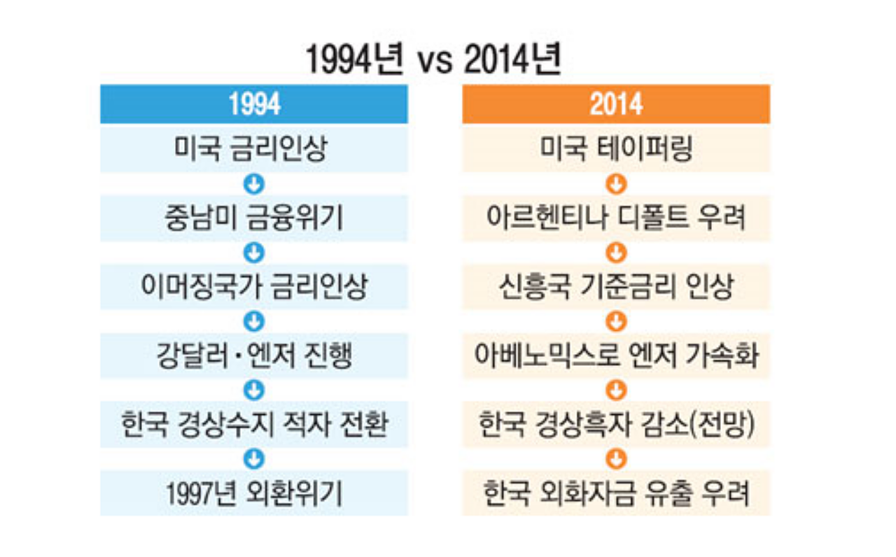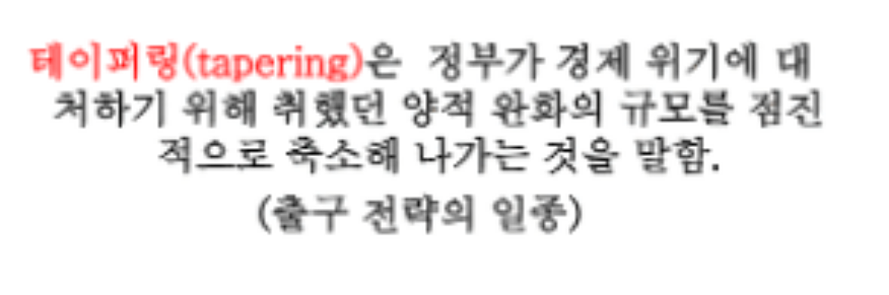 위에 말씀드린것처럼 미국연준은행(연방준비은행)에서 양적완화 정책의 규모를 점진적으로 축소해 나가겠다는 것을 이야기 하는 것입니다. 그래서 테이퍼링을 간결하게 말하면 양적완화와는 반대 되는 개념으로 볼 수 있습니다. 현재 펜데믹 사태 이후 계속된 달러를 찍어내고 있는 상황으로 경기는 점점 좋지 않아지고 있습니다. 그런데 이 테이퍼링은 점진적으로 또는 가늘어진다 즉 경기를 다시 끌어올리기 위해서 돈을 점차 거둬들인다는 뜻이라고 보시면 됩니다. 그런데 이 테이퍼링으로 인해서 신흥국들에서 달러가 빠져나가게 되면 일부의 신흥국가들은 외환 위기를 당할 가능성도 있다는 것입니다. 현재 대한민국은 이런 위기는 덜하지만 그래도 안심할 수는 없다는 것입니다.